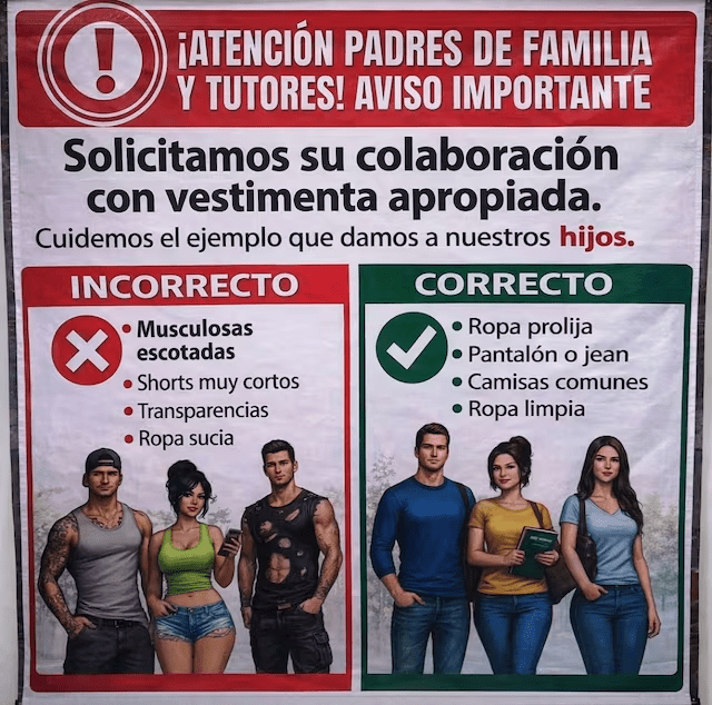 Este código de vestimenta fue anunciado en la entrada de la escuela primaria Antonio Bustilllos Carrillo, donde piden a padres y tutores presentarse con “vestimenta apropiada”.