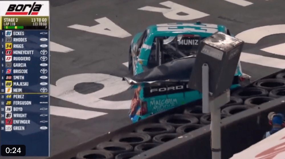 El choque de Muniz se dio en la curva 3 del circuito, cuando tuvo un contacto con Tyler Reif, por lo que ambos perdieron el control de sus autos, siendo el también el actor el que sufrió la peor parte, aunque ambos vieron a sus autos con fuertes daños.